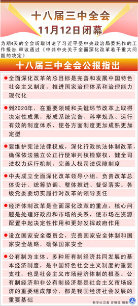 新华网北京11月12日电 12日闭幕的中国共产党第十八届中央委员会第三次全体会议通过的公报,明确了全面深化改革的总目标、总任务等,“新华视点”记者从中梳理出了十大看点。