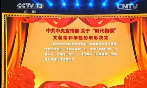 “时代楷模”发布以“我们的价值观、我们的中国梦”为主题,现场发布了文朝荣和李超的先进事迹,宣读了《中共中央宣传部关于“时代楷模”文朝荣和李超的表彰决定》,播放了反映他们先进事迹的短片,展示了中国楹联学会、中华诗词学会创作的反映他们先进事迹的楹联、诗词和小传。“时代楷模”马善祥向文朝荣的亲属和李超颁发了纪念章和荣誉证书。