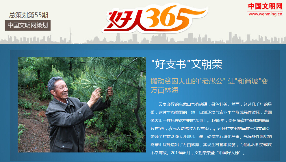 中国文明网2014年开设了《好人365》专栏,该专栏是中国文明网一个全面展示中国好人榜上榜人物事迹的专栏,每天讲述一位“中国好人”的平凡故事,旨在传播好人事迹,传递道德正能量。目前已登载150余期。“好支书”文朝荣有幸在第55期荣登该栏目,而贵州各地新闻网站和文明网站也随后在网页重要位置第一时间进行展示,希望让广大网友通过《好人365》这一传播文明正能量的平台来了解每一个好人的故事。