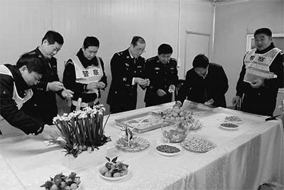 大年三十,江苏省淮安市交巡警支队民警坚守岗位。换班期间,一线民警包饺子迎新年。 记者 郭万盛摄