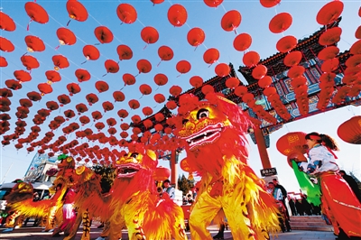 2月18日,北京地坛庙会在精彩的舞狮表演中拉开帷幕。 本报记者 贺 勇摄