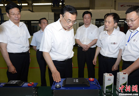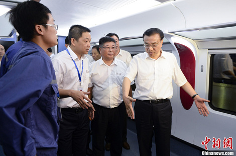 被称为中国装备“超级推销员”的李克强2014年7月4日在湖南考察南车集团株洲电力机车股份有限公司时,与院士交流技术细节,细致探讨电控、动力系统、米轨平衡力等专业问题,称赞“没想到技术发展这么快”。与李克强交流的行家事后赞叹,总理提问“十分专业”。 中新社记者 刘震 摄