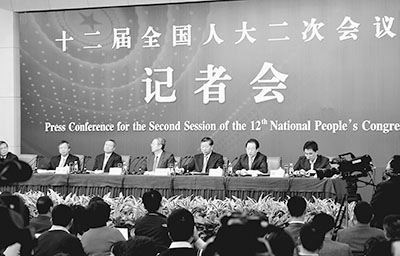 2014年3月11日,十二届全国人大二次会议记者会在北京举行。多位部委领导应邀参加记者会并回答中外记者提问。 古雨摄