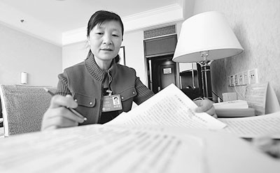 2014年全国两会期间,江苏淮安环卫工孙国庆代表正在整理建议案。李舸摄