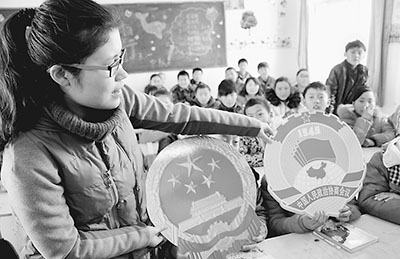 2014年3月6日,河南省内黄县第四实验小学老师在给孩子们讲解两会会徽。刘肖坤摄