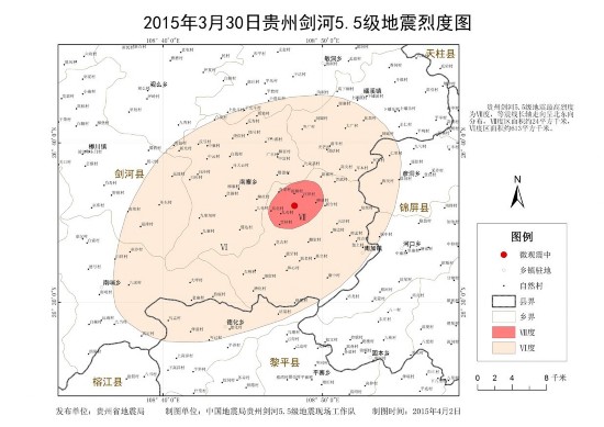 2015年3月30日贵州剑河5.5级地震的地震烈度分布图,中国地震局现场工作队依照《地震现场工作第3部分:调查规范》(GBT 18208.3-2011)、《中国地震烈度表》(GBT 17742-2008),通过灾区震害调查,参考地震构造、震源机制解以及余震分布等资料,圈定了本次地震烈度分布。