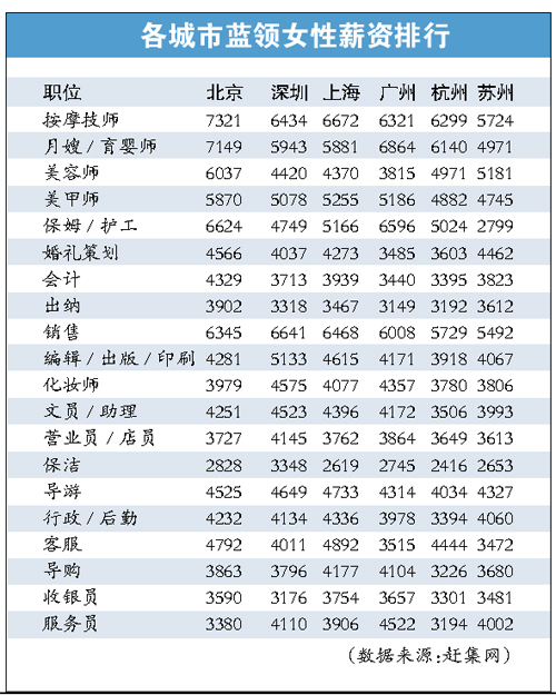 报告显示就新蓝领女性薪资城市排行而言,深圳市和上海市的新蓝领女性薪资最高,北京市和广州市紧随其后。其他进入前15的城市多为省会、直辖市等。而就职位薪资而言,按摩技师职位月薪最高,也是新蓝领女性职位薪资TOP20里唯一月薪超过6000元的职位;其次是月嫂/育婴师和美甲师。