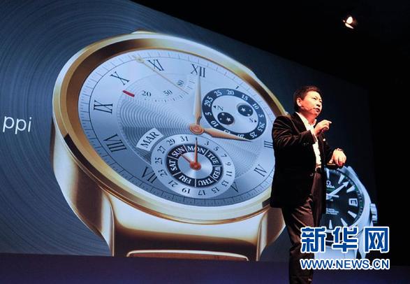 资料图片:2015年3月1日,在西班牙巴塞罗那的世界移动通讯大会开展前夕,华为消费者BG营销总裁余承东展示基于Android Wear平台的智能手表华为Watch。 新华社记者 谢海宁 摄