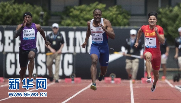 5月30日,苏炳添(右一)在比赛中。当日,在国际田联钻石联赛尤金站男子100米比赛中,中国选手苏炳添以9秒99的成绩获得第三名,打破全国记录。 新华社记者杨磊摄