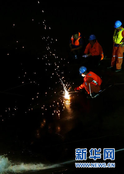 新华网北京6月3日电 火花飞溅。夜幕中,船体切割作业开始。