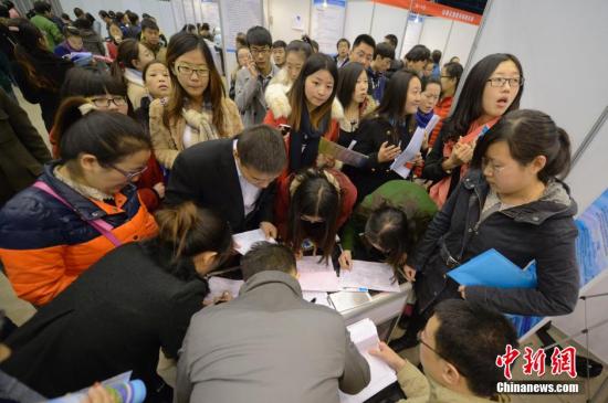 资料图:在山西太原举办的人才智力交流大会上,上万名应届大学毕业生涌进现场,寻找工作。(中新社发 韦亮 摄)