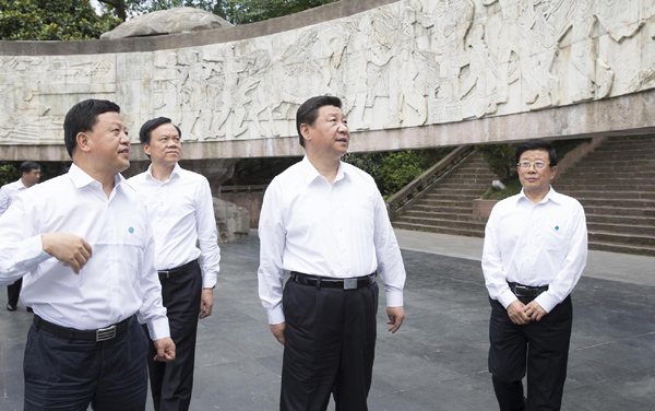 新华网北京6月16日电 据新华社客户端报道,蓝天白云,青松翠柏。习近平总书记16日离京来到贵州遵义考察,一下飞机就直奔红军山烈士陵园,向红军烈士纪念碑敬献花篮。纪念碑四周的浮雕展现了当年红军浴血奋战的场景。在“突破乌江天险”浮雕前,总书记驻足感叹:“当时要是过不去就危险了……”碑上“红军烈士永垂不朽”8个字是邓小平同志题写的,他伫立凝望,听取介绍。这是党的十八大后习近平总书记第一次来黔考察。