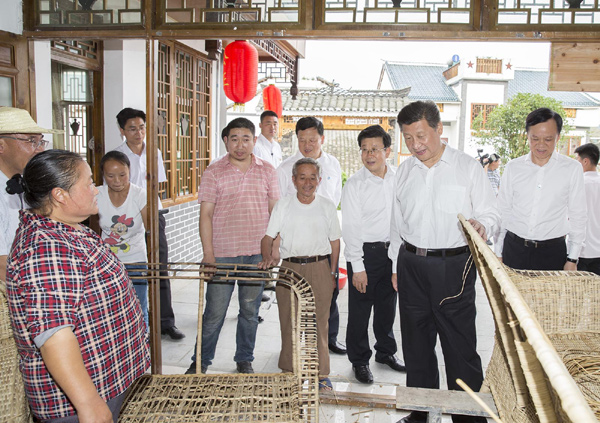 路旁田里,连片的向日葵花开得正艳,习近平下车驻足欣赏。当地干部告诉总书记,伴随美丽乡村建设,山花繁茂的花茂村成了婚纱拍照地,不少附近的市民结婚都到这来。沿着土墙和木栏相伴的乡村小径,习近平边走边询问当地脱贫致富情况。看到鲜花盛开,道路两旁的房子干净整洁,他有感而发地说:“怪不得大家都来,在这里找到乡愁了。”听说水电路都解决了,他又关切地询问卫生情况。看到几位村民正在路边房子里编藤椅,他走进去问:“编一个多长时间?”听说一个三人座藤椅只要编4天,能卖1200块钱,他说:“如果销路好,那收入还挺高。”