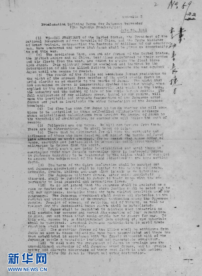 新华网北京7月25日电(记者陈聪)70年前的7月26日,一份奠定战后国际秩序基础的重要文件——《波茨坦公告》发表。抚今追昔,时隔70年后重温这段历史,依然令人深感其意义深远而重大。