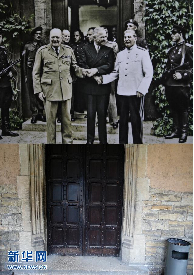 这张拼版照片的上图是记者翻拍的苏联、美国和英国三国首脑斯大林(右)、杜鲁门(中)和丘吉尔参加波茨坦会议的资料照片;下图是2015年7月23日拍摄的波茨坦会议旧址一角。新华社记者张帆摄