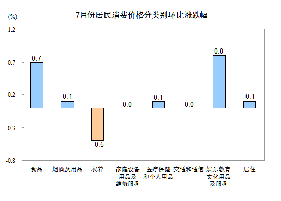 7月份,全国居民消费价格总水平环比上涨0.3%。其中,城市上涨0.3%,农村上涨0.3%;食品价格上涨0.7%,非食品价格上涨0.1%;消费品价格上涨0.2%,服务价格上涨0.5%。