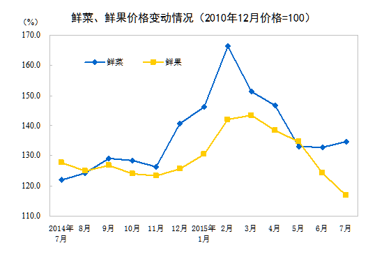 2015年7月份,全国居民消费价格总水平同比上涨1.6%。其中,城市上涨1.7%,农村上涨1.5%;食品价格上涨2.7%,非食品价格上涨1.1%;消费品价格上涨1.4%,服务价格上涨2.2%。1-7月平均,全国居民消费价格总水平比去年同期上涨1.3%。