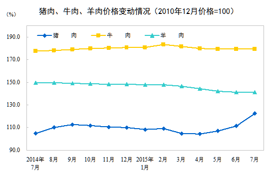 7月份,食品价格同比上涨2.7%,影响居民消费价格总水平上涨约0.91个百分点。其中,鲜菜价格上涨10.5%,影响居民消费价格总水平上涨约0.30个百分点;肉禽及其制品价格上涨7.6%,影响居民消费价格总水平上涨约0.56个百分点(猪肉价格上涨16.7%,影响居民消费价格总水平上涨约0.48个百分点);粮食价格上涨1.9%,影响居民消费价格总水平上涨约0.06个百分点;鲜果价格下降8.4%,影响居民消费价格总水平下降约0.20个百分点;蛋价下降14.3%,影响居民消费价格总水平下降约0.13个百分点。