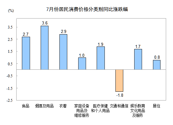 7月份,非食品价格同比上涨1.1%。其中,烟酒及用品、衣着、医疗保健和个人用品、娱乐教育文化用品及服务、家庭设备用品及维修服务、居住价格分别上涨3.6%、2.9%、1.9%、1.7%、1.0%和0.8%;交通和通信价格下降1.8%。
