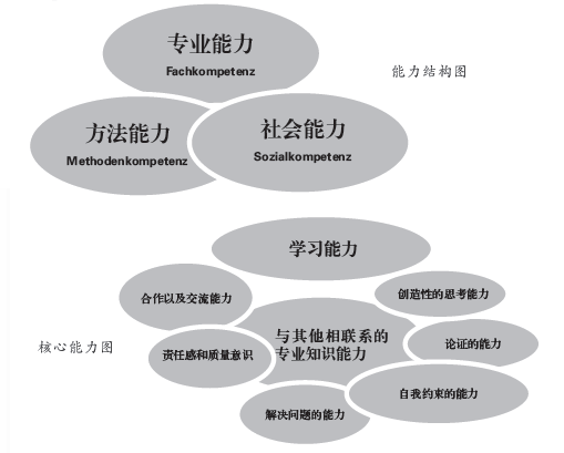 德国技术合作公司(GTZ)的君德·瓦格纳博士2013年2月在他的论文“在全球化的背景下—国际职业教育教学改革状况和未来的发展趋势”中提出显著的全球化趋势带来四个明显结果:1.以前,企业在一个国家里,只有一个市场,一个政府和一个文化;现在他们在一个国际化的大环境下运作;2.利用信息和交流技术,公司能够调度物流和后勤(例如,及时生产);3.各种人力资源的流动(例如:跨企业的,跨省的,跨国家的)是一个普遍的现象;4.在中外合作中,拥有不同文化背景和学历的人员为了共同的目标精诚合作。君德·瓦格纳博士提出跨国企业对毕业生能力的期望,其顺序是:操作技能,职业道德,初级外语,初级计算机应用能力,交际能力,基础知识,专业知识,安全知识,身体健康、自学能力,管理能力。他还提出了能力结构图和核心能力图(见上图)。
