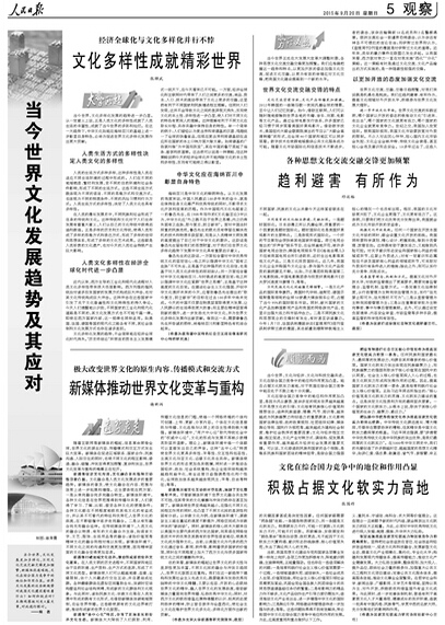 当今世界,文化发展更加多样化,不同文化交流交融交锋更加频繁,新媒体迅速崛起,文化在综合国力竞争中的地位和作用凸显。世界文化发展的这些新趋势对我国文化建设意味着什么?如何积极应对?本期观察版刊发4篇文章,对此进行探讨。
