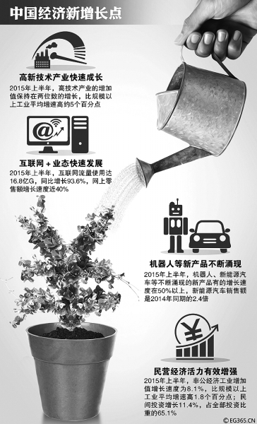 产业结构调整扎实推进,工业主导向服务业主导转型趋势明显。上半年服务业增长8.3%,占国内生产总值比重上升到52.5%。新登记企业中第三产业为160.7万户,占比80.3%。工业结构加快调整,传统产业中缺乏竞争力的企业逐步退出市场,高技术产业和先进制造业保持较快增长,新能源汽车、工业机器人、智能电视、轨道交通设备等产量实现两位数甚至成倍增长。