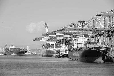 山东青岛港外贸集装箱码头,货轮在装载集装箱。CFP