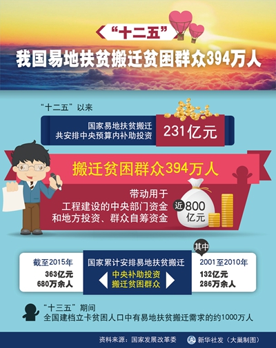 新华网北京10月16日电(记者安蓓、赵超)记者16日从国家发展改革委了解到,“十二五”以来,国家易地扶贫搬迁共安排中央预算内补助投资231亿元,搬迁贫困群众394万人,并因此带动用于工程建设的中央部门资金和地方投资、群众自筹资金近800亿元。