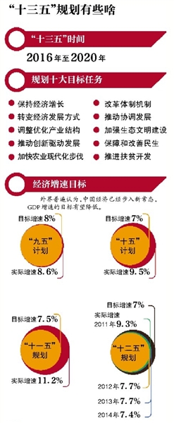 日前,人民日报官方微博公布了“十三五”规划十大目标任务,分别是保持经济增长、转变经济发展方式、调整优化产业结构、推动创新驱动发展、加快农业现代化步伐、改革体制机制、推动协调发展、加强生态文明建设、保障和改善民生、推进扶贫开发。除了经济增速以外,区域发展、生态文明建设也成为关注热点。