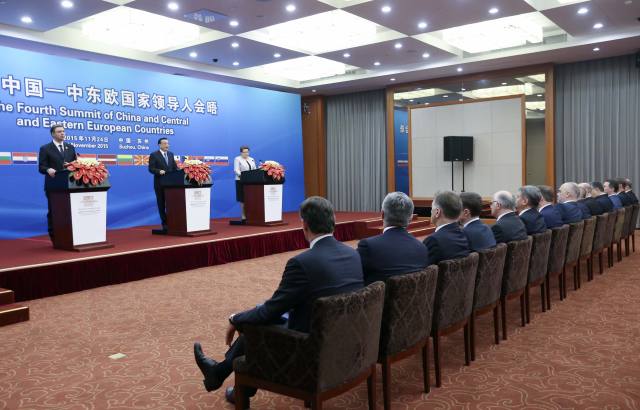 会晤后,李克强总理与上次东道主塞尔维亚总理武契奇、明年东道主拉脱维亚总理斯特劳尤马共见记者。其他中东欧14国领导人台下就坐。现场一外交官惊叹道,这场记者会出席领导人级别、规模堪称“史无前例、史上最强”。(新华国际客户端报道)