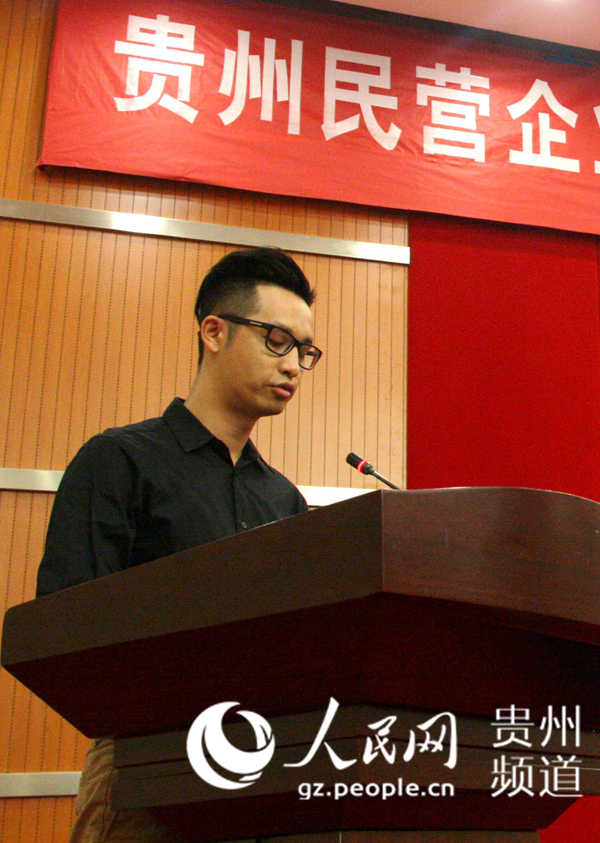 贵州神奇集团“80后”总裁张涛涛,代表神奇集团在扶贫动员会上发言。 李桐 摄