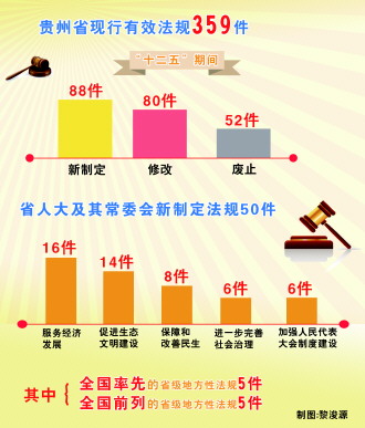 立法成效取得新进展。“十二五”以来,省人大及其常委会新制定地方性法规50件、修改48件、废止28件;省人大常委会批准贵阳市新制定地方性法规15件、修改29件、废止12件;批准3个自治州、11个自治县新制定单行条例23件、修改3件、废止12件。截至目前,我省现行有效法规359件(含决议、决定)。“十二五”时期我省地方立法进展较快,成效明显,为推进全面依法治省提供了良好法制基础。