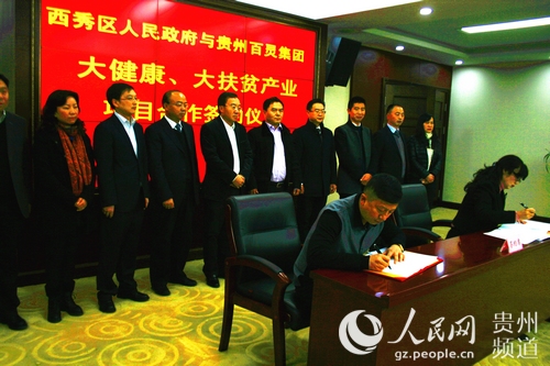 人民网安顺1月14日电 1月13日,西秀区人民政府与贵州百灵集团在西秀区行政中心会议室签定“大健康大扶贫产业项目合作协议”。西秀区委副书记、区长张勇,贵州百灵集团董事长姜伟等出席签约仪式。副区长王晓宁、百灵医药销售公司总经理刘诗勇分别代表双方在合作协议上签字;迈向政企携手,共襄大健康大扶贫产业的第一步。