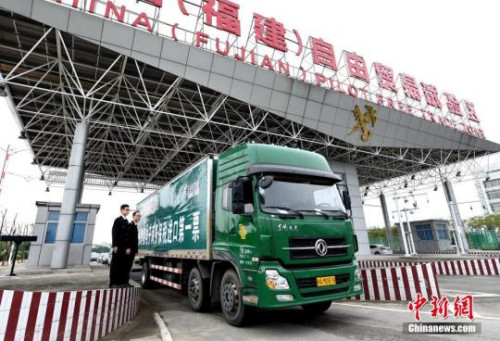 资料图:2015年11月3日,在福州出口加工区监管中心,福州跨境电子商务首票保税第一单通过海关监管后开出福州马尾出口加工区。中新社记者 王东明 摄