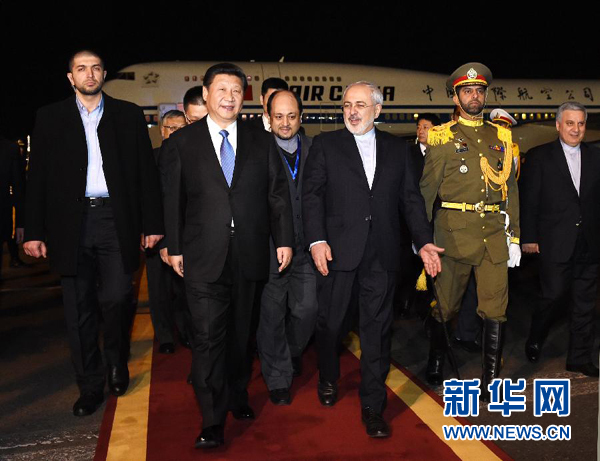 图为1月22日,国家主席习近平乘专机抵达伊朗首都德黑兰,开始对伊朗进行国事访问。这是在梅赫拉巴德机场,习近平受到伊朗外交部长扎里夫等热情迎接。(新华社记者饶爱民摄)