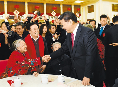 2月6日,中共中央、国务院在北京人民大会堂举行2016年春节团拜会。这是中共中央总书记、国家主席、中央军委主席习近平同首都各界人士亲切握手,互致问候和新春祝福。