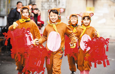 2月7日,除夕,在安徽省合肥市瑶海区明光路街道填海巷社区,孩子们穿上卡通猴服饰为社区老党员和空巢老人送“福”字灯笼。活动中,身穿卡通猴服饰的“猴娃”们将一盏盏红红的“福”字灯笼送到社区老党员和空巢老人的手中,为他们送去温暖,表达猴年新春的祝福。