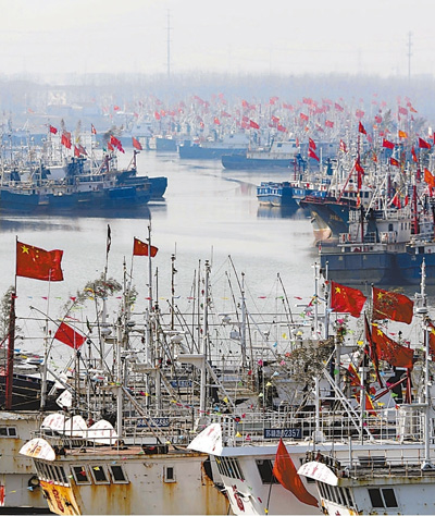 2月7日,农历除夕,江苏连云港市赣榆区青口中心渔港,靠岸的千余艘渔船挂起崭新的国旗,迎接新春佳节的到来。