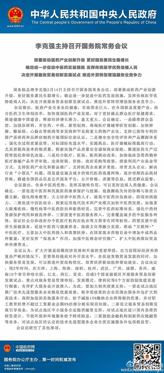 会议决定,用两年时间,在天津、上海、海南、深圳、杭州、武汉、广州、成都、苏州、威海10个省市和哈尔滨、江北、两江、贵安、西咸5个国家级新区开展服务贸易创新发展试点,重点对服务贸易管理体制、发展模式、便利化等8个方面的制度建设进行探索,有序扩大服务业的开放准入。