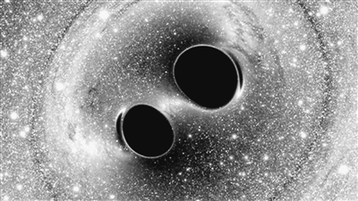 模拟图显示两个黑洞碰撞并合,产生引力波。