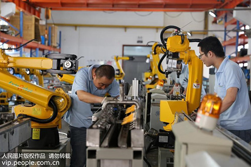 2015年8月25日,在浙江瑞宏机器人有限公司车间里,技术人员正在调试机器人。(魏炜摄/人民图片)