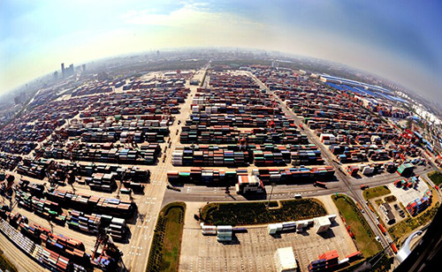 这是在警航巡逻直升机上拍摄的上海自贸区外高桥集装箱码头。(新华社记者凡军摄)