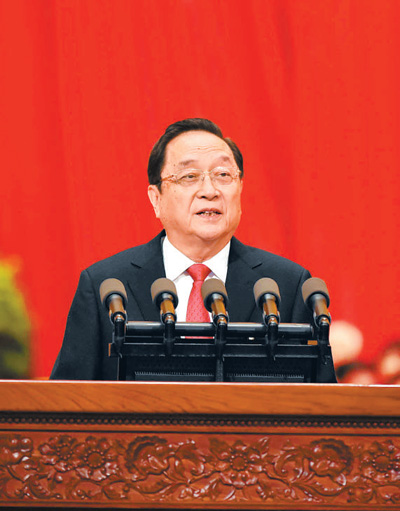 俞正声代表政协第十二届全国委员会常务委员会,向大会报告工作。