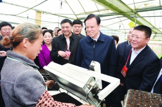 4月8日,贵州省委书记、省人大常委会主任陈敏尔率2016年第一次全省项目建设现场观摩会代表到修文县小箐乡蔬果现代高效休闲观光农业(扶贫)示范园区考察。 邓刚 摄