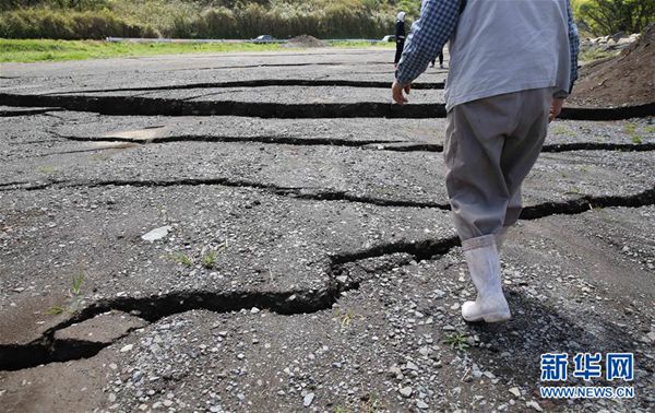 4月17日,在日本熊本县南阿苏村,一名居民走过在地震中受损的路面。日本南部九州地区16日凌晨发生7.3级地震,地震在山区引发山体滑坡等灾害,其中位于熊本县东部山区的南阿苏村灾情严重。 新华社记者刘天摄