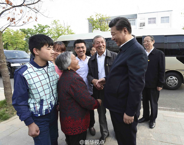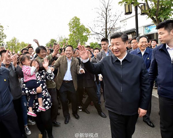 25日下午,习近平来到小岗村4300亩高标准农田示范点,沿着田埂走进麦田,察看小麦长势,向村干部、种粮大户和农技人员了解土地流转、农田整理、种植品种、亩产量、病虫害防治、粮食收购等情况。听了大家介绍情况,总书记说,现在正值抽穗灌浆的关键时期,要加强田间管理,实现丰收,今年的白馍能吃到嘴里了。