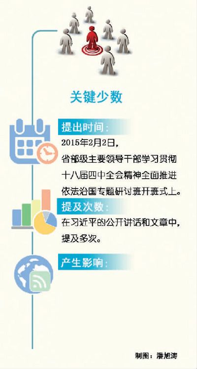 “关键少数”一词首次走进公众视线,是在2015年2月2日的省部级主要领导干部学习贯彻十八届四中全会精神全面推进依法治国专题研讨班的开班式上。当时,习近平指出,全面依法治国必须抓住领导干部这个“关键少数”。
