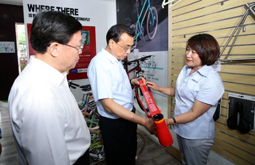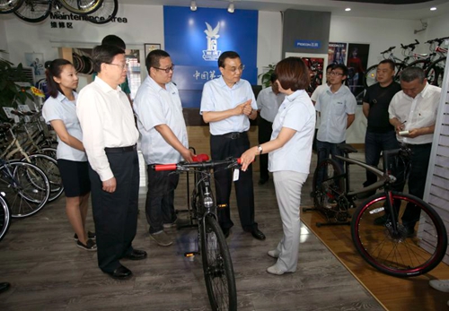 人民网天津6月26日电(记者 杨芳) 李克强26日走进飞鸽自行车天津胜利路体验店。这里摆放着不同档次、材质和性能各异的自行车。总理来到一辆碳纤维自行车前掂了掂重量,又亲自体验了一下这辆超级智能自行车的性能。他说,我愿为中国自行车做广告,更愿为“中国制造”智能升级“站台”。