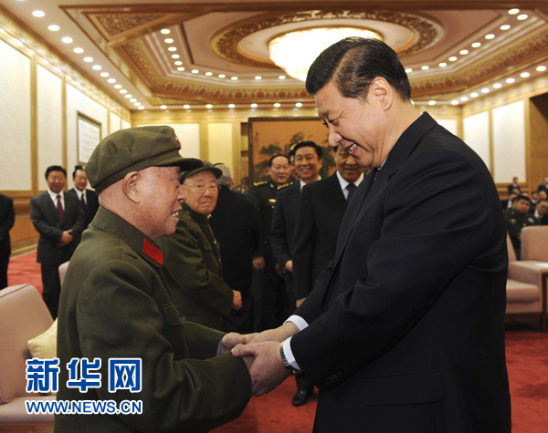 2011年11月4日,纪念中央革命根据地创建暨中华苏维埃共和国成立80周年座谈会在北京举行。时任中共中央政治局常委、国家副主席、中央军委副主席习近平出席会议并讲话。这是习近平同出席座谈会的老红军代表亲切交谈。新华社记者李学仁摄