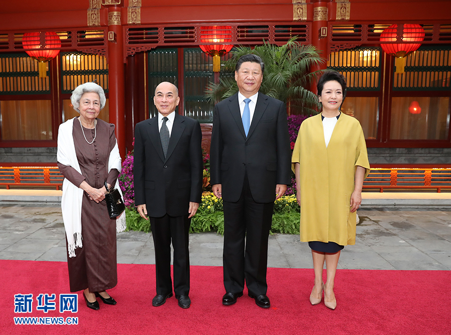 9月19日,在中秋佳节来临之际,国家主席习近平和夫人彭丽媛在钓鱼台国宾馆亲切看望正在北京休养的柬埔寨国王西哈莫尼和太后莫尼列。新华社记者 黄敬文 摄